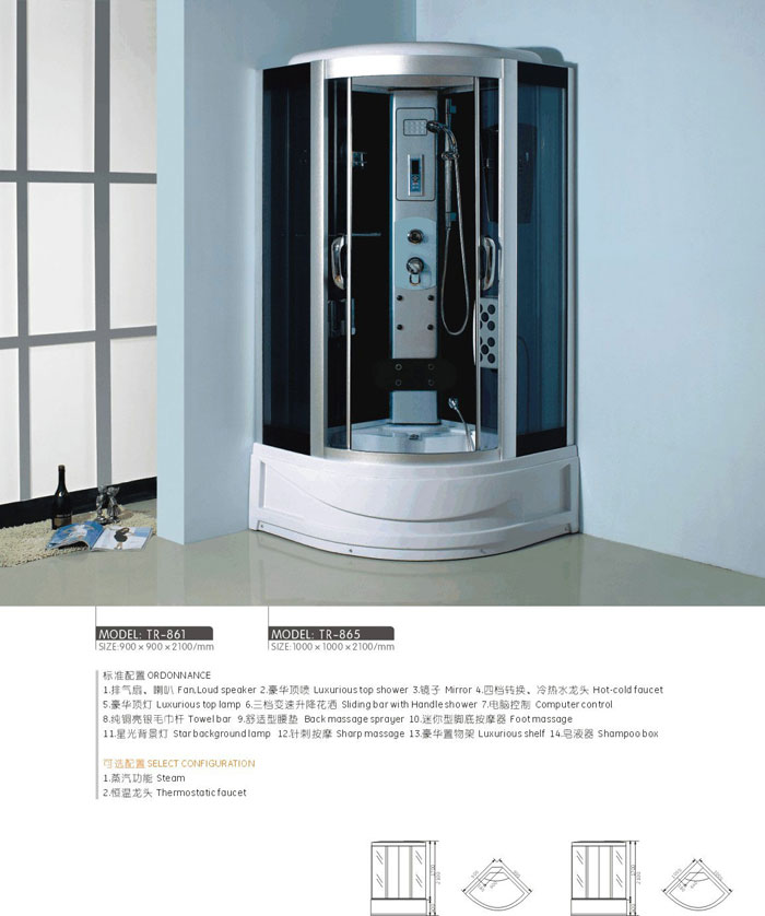 1.排气扇,喇叭 . 2.豪华顶喷 花洒 3.镜子 4.五档转换、冷热水龙头 5.满天星顶灯 6. 三档变速花洒 7.电脑控制 8.毛巾杆 9.星光背景灯 10.迷你型脚低按摩器 11.针刺按摩 12.豪华置物架 13.沐浴盒 推荐配置: 1.蒸汽功能 2.恒温水龙头